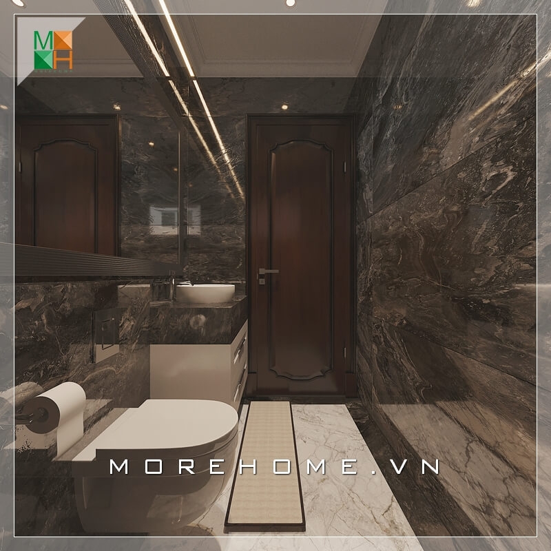 Lựa chọn thiết kế phòng tắm nhỏ, đơn giản nhưng không kém phần tiện nghi, sang trọng đặc biệt với đá ốp tường màu nâu ấn tượng dành cho nhà phố