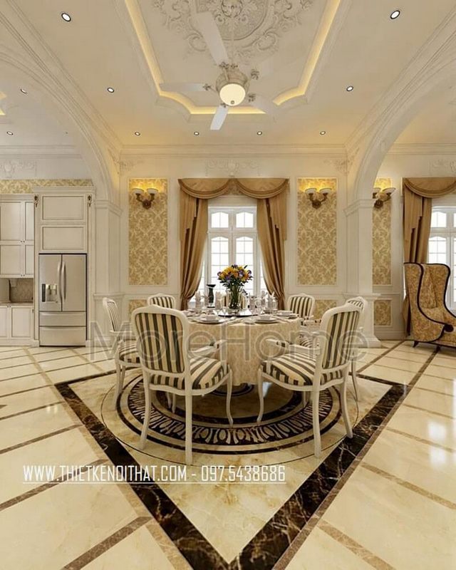 Mẫu trần thạch cao giật cấp với hoa văn tân cổ điển tỉ mỉ, sang trọng cho phòng ăn